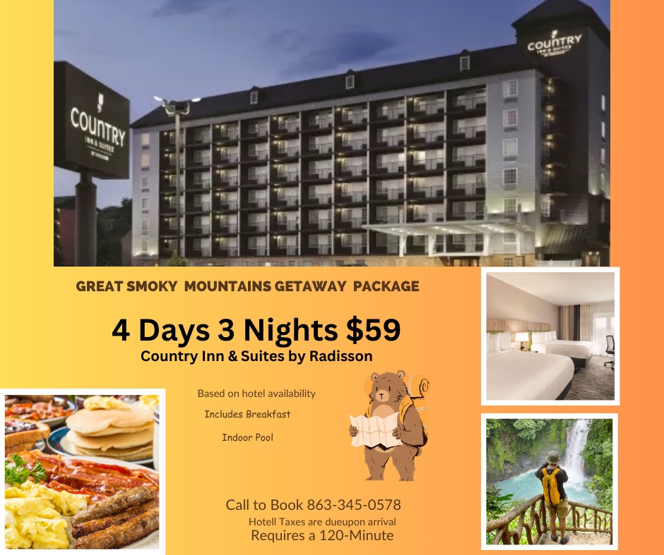 4 days 3 nights hotel accommodations sleeps 4 people Gatlinburg is full of festivals and events. There is something for everyone year-round. Winter Magic kicks off the first week in November continuing through February. Spring events, Summer fun, Craftsmen’s Fairs, Ziplining, Anakeesta, Ripley’s Aquarium Moonshine, Whisky, and Wineries are always offering free tasting. Pigeon Forge is where visitors will find most shows; and attractions. Dollywood; dinner theaters such as Dolly’s Stampede, Pirates Voyage, Hatfield, and McCoy-for just a show you can see Americas Hit Parade and Soul of Motown. Attractions like Sky Land Ranch, Paula Deen’s Lumber Jack Feud, Vacation Packages require Travelers attend (1) 90-120 minute resort preview presentation, major credit active Drivers License Travelers must be between 25 and 75 years old Hotels are based off availability. No bankruptcy, no new home purchase, and no lien in the past 4 years. Not signing to buy a new home