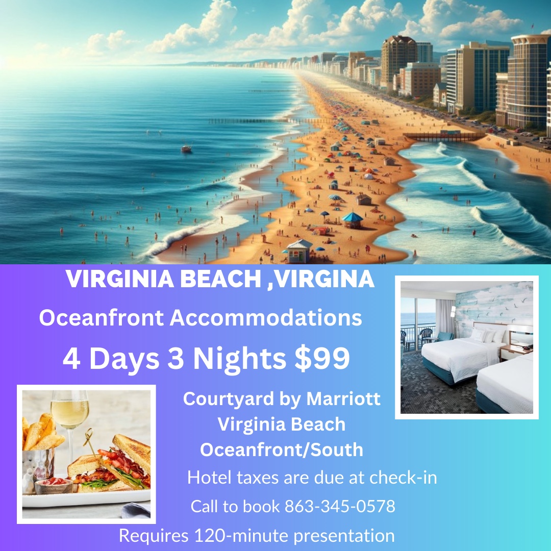 Visit the Courtyard by Marriott South Virginia Beach Oceanfront and experience all that Virginia Beach has to offer. Three miles of beaches, need I say more? Virginia Beach has one of the longest boardwalks in the world, and alongside is over three miles of sand, surf and sun. From our southern beach resort with access to fishing, surfing, and quality family time – to the centrally located oceanfront property in the middle of all the action – to our “gateway to the beach” property with the most convenient access and largest suites. Property is determined based on availability Our Destination Guide will review each property with you, determined by availability of *Note: Peak Season pricing is charged at $339 per night, which runs yearly from June 1st – August. This $99 price is not valid through those months Requires a 120-minute presentation married, cohab, single income of 50,000 major credit card, active Drivers license, 25-76 years of age. No bankruptcy,